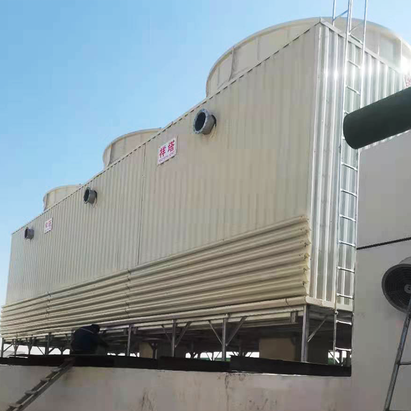 橫流式玻璃鋼冷卻塔簡介本系列橫流式玻璃鋼冷卻塔采用兩側進風,靠頂部的風機,使空氣經由塔兩側的填料,與熱水進行介質交換,濕熱空氣再排向塔外。填料采用兩面有凸點的點波片,通過安裝頭使點波片粘結成整體,以提高剛性,兩面的凸點還可避免直接滴水,因此提高了水膜形成能力,填料尾部設有收水措施。