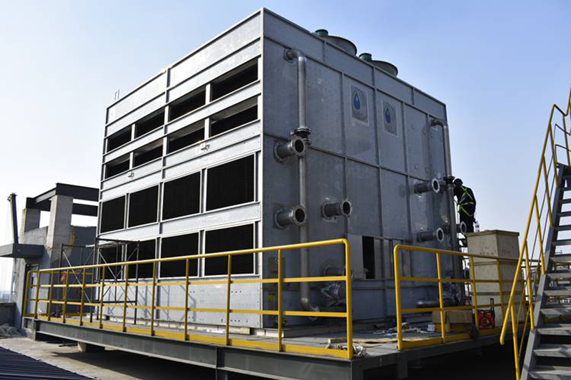 高溫工作流體進(jìn)入表冷器,廢熱通過盤管外壁與下落的噴淋水接觸進(jìn)行熱質(zhì)交換并與側(cè)面進(jìn)風(fēng)的干冷空氣垂直交替形成飽和的濕熱空氣。熱量由頂部風(fēng)機(jī)排出,水分則由特殊結(jié)構(gòu)的脫水器擋回集水槽循環(huán)使用。不同于逆流式,橫流式的噴淋水首先經(jīng)過PVC填料預(yù)冷,其換熱效果更加明顯。